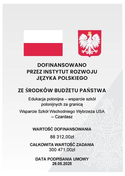 Serdecznie dziękujemy za okazane zaufanie i dofinansowanie naszej działalności. Dzięki otrzymanemu wsparciu możemy jeszcze skuteczniej realizować naszą misję – nauczanie języka polskiego oraz pielęgnowanie tradycji i kultury polskiej wśród dzieci i młodzieży polonijnej.